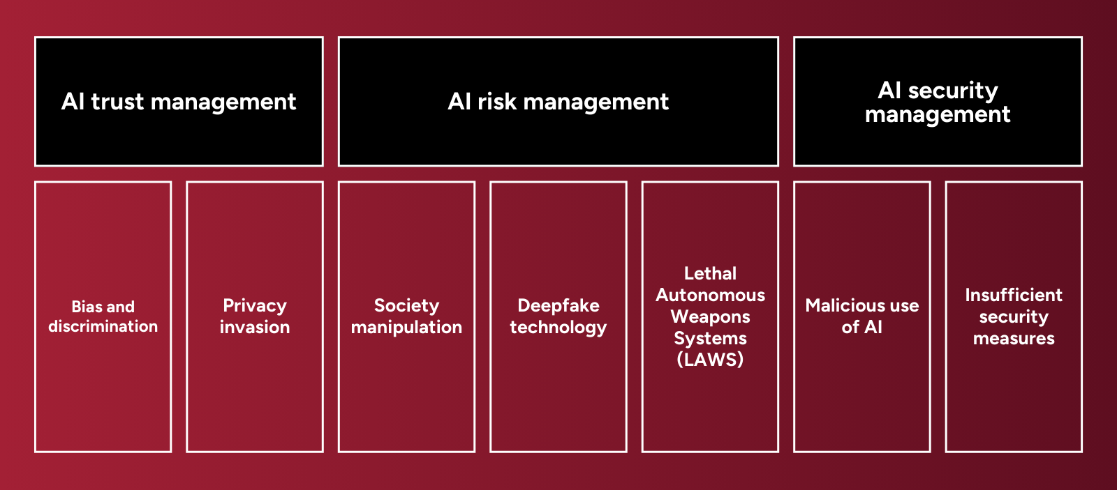 This paper presents an overview of AI challenges organized into the AI TRiSM framework’s three primary aspects, each consisting of distinct threat types and damages.
