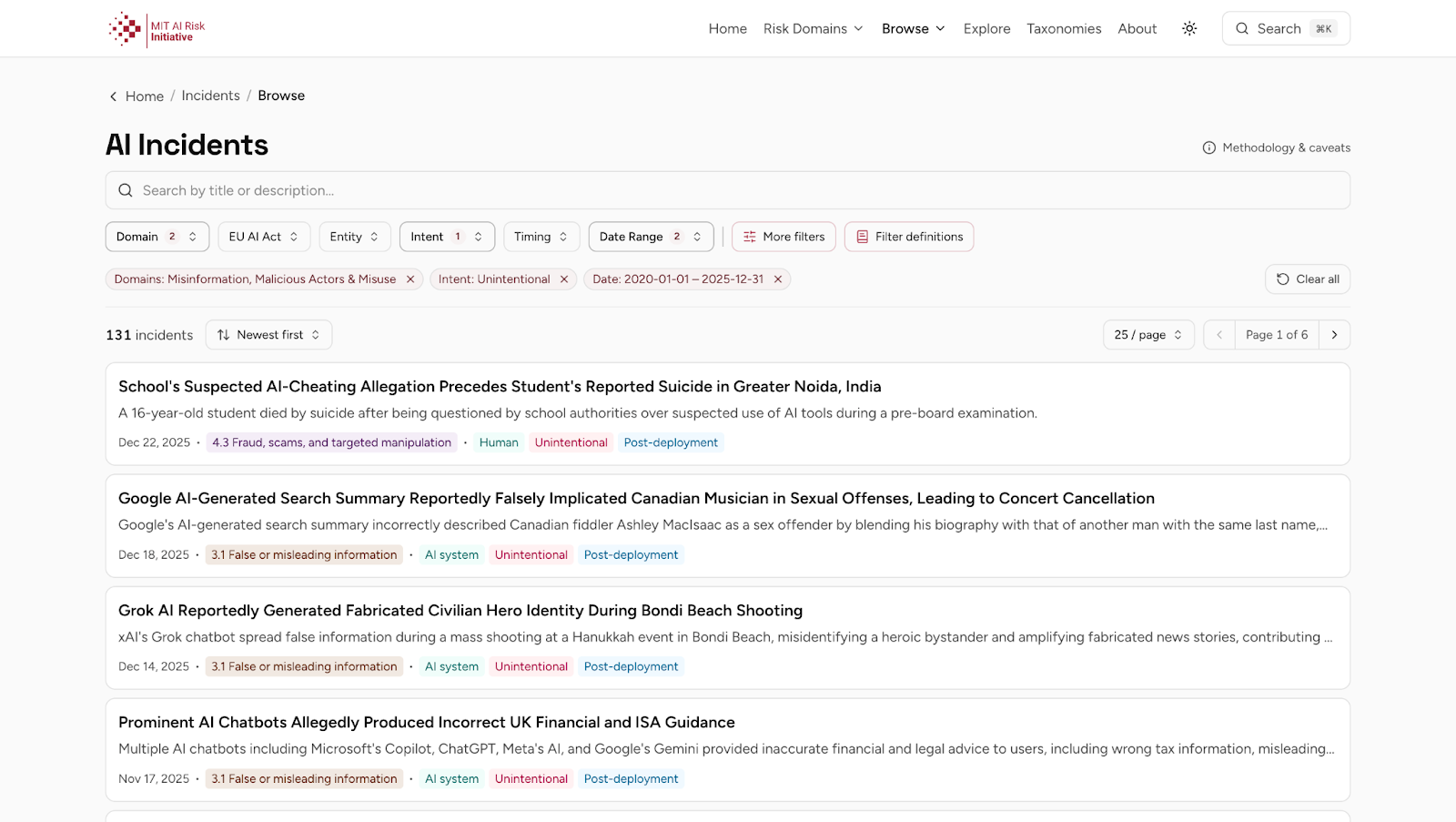 The dedicated taxonomy page provides a full interactive reference for the classification structure, including definitions for every domain and the causal dimensions — entity, intent, and timing — that cut across the risk and incident datasets.