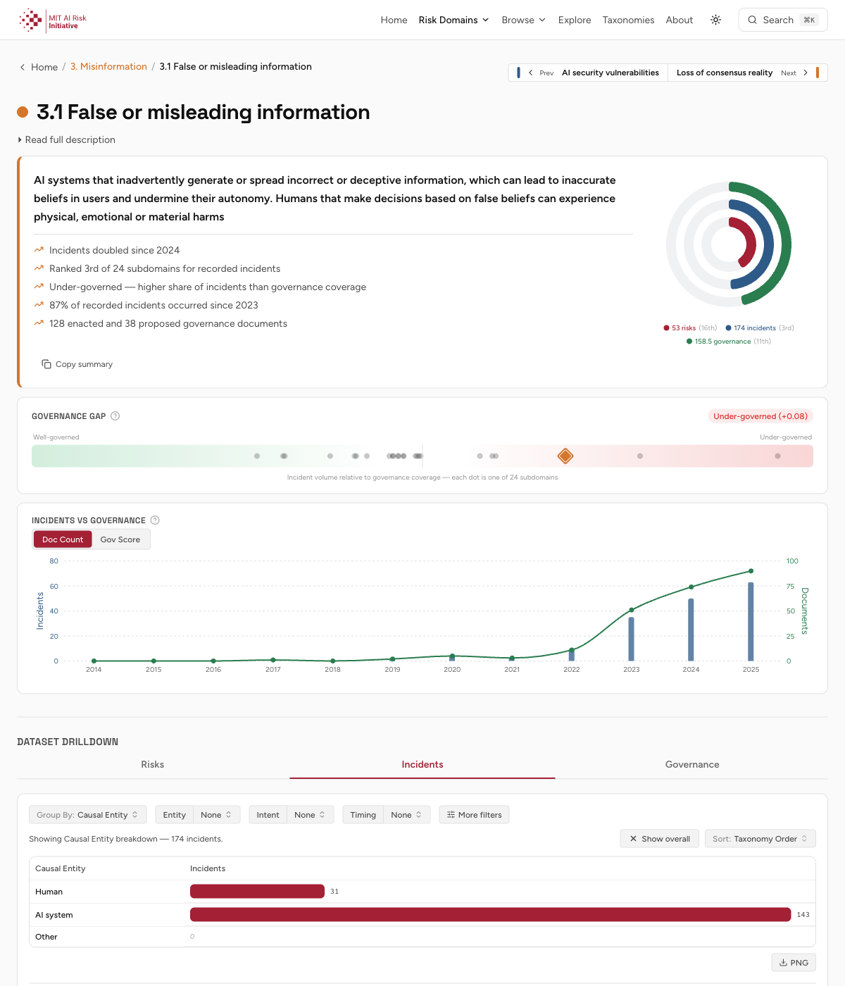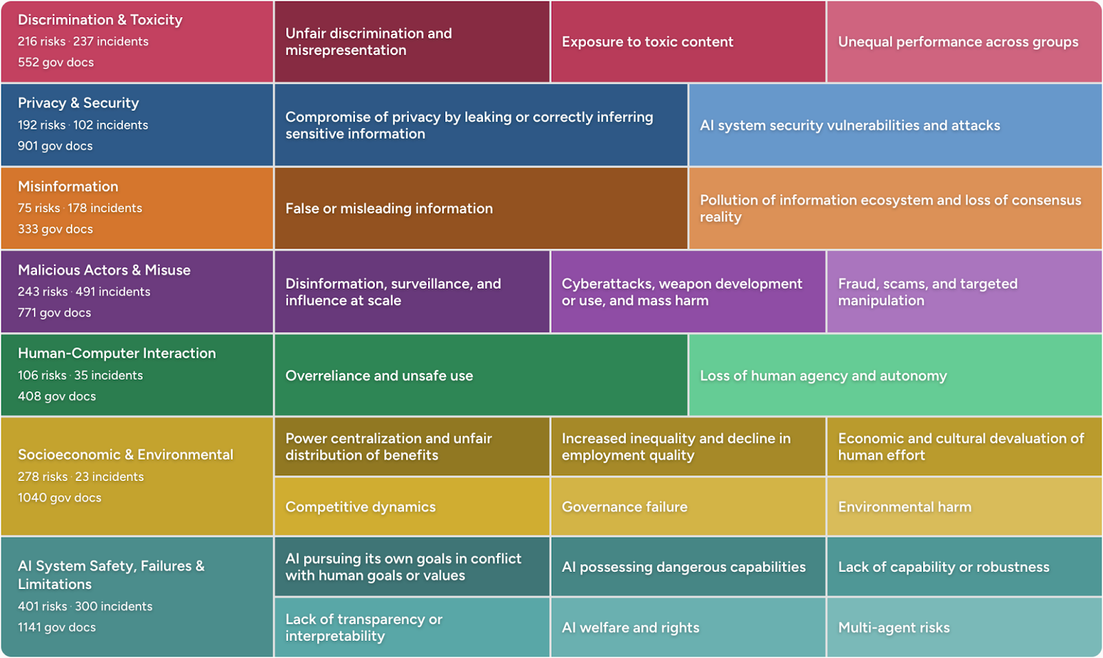 AIRI’s datasets are individually valuable, but their real power lies in what they reveal when connected. The Navigator uses AIRI’s risk domain taxonomy as a shared backbone — pick a subdomain, and you can immediately see the academic risk landscape, the real-world incident record, and the governance response in one place. This is a valuable tool for a variety of users: