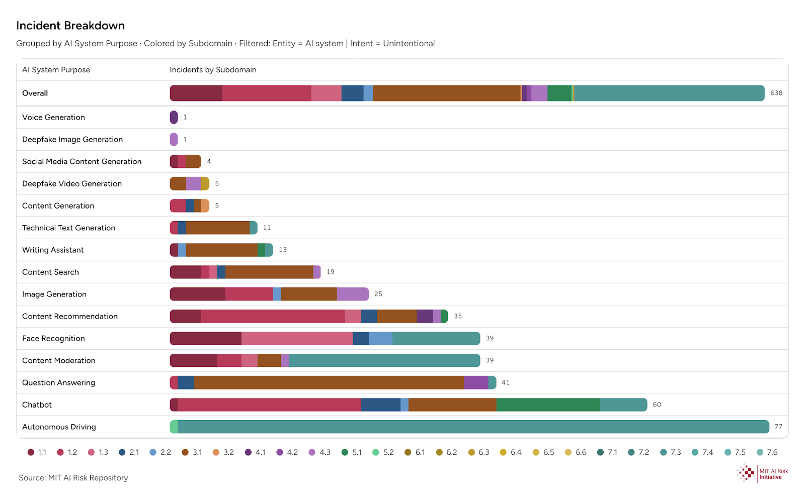 Each of the risk domains and subdomains have their own detail pages that bring together data from across AIRI's datasets in a single view. Rather than navigating four separate databases and mentally connecting what you find, you can arrive at a subdomain page and the relevant data is already assembled. Each page contains information about the subdomain, findings from the datasets, and visuals to understand how it’s represented in the data.