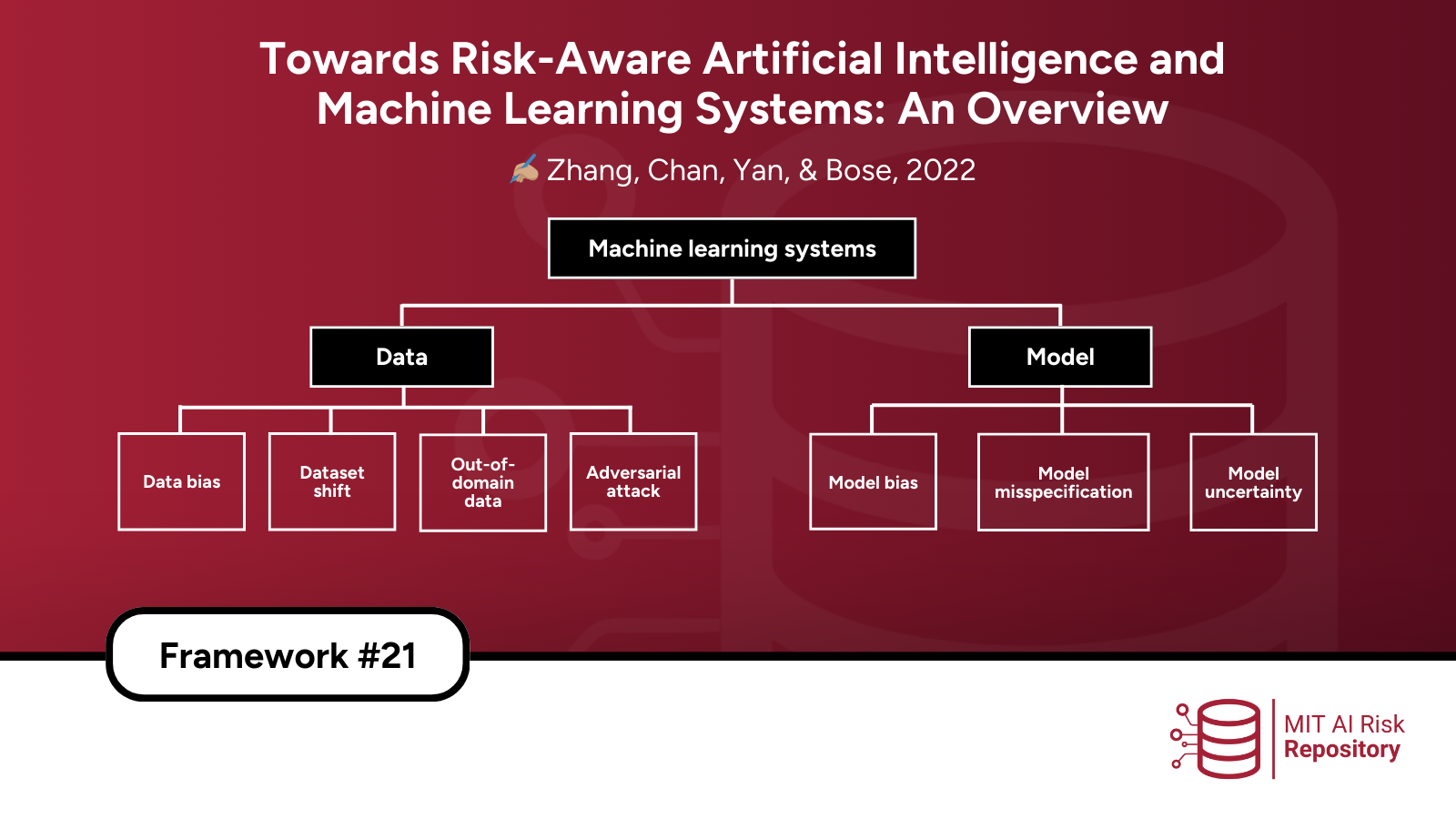 This week we spotlight the twenty-first framework of risks from AI included in the AI Risk Repository: Zhang, X., Chan, F. T. S., Yan, C., & Bose, I. (2022). Towards risk-aware artificial intelligence and machine learning systems: An overview. Decision Support Systems, 159, 113800. https://doi.org/10.1016/j.dss.2022.113800